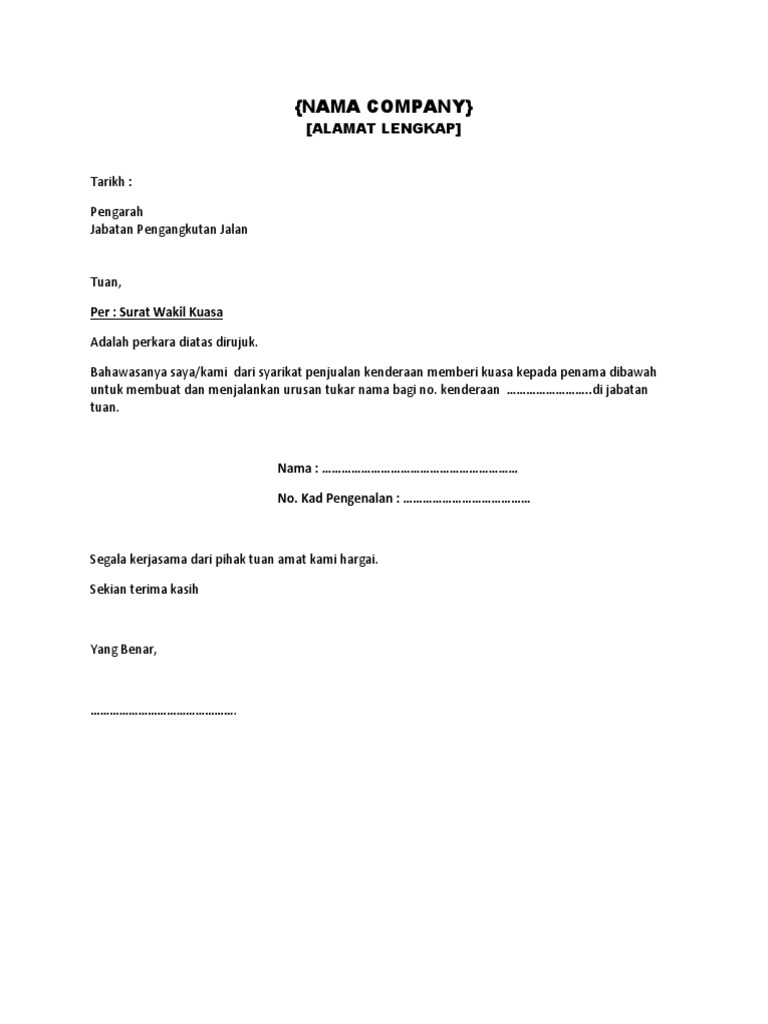 Surat Wakil Syarikat Kenderaan Surat Wakil Contoh Surat Kuasa Wakil Syarikat Img Your Booreeckszs